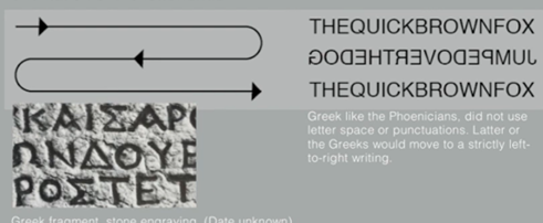 The Greeks wrote from right to left and left to right alternately, the reading direction is same as writing. The Greek developed the style of writing called 'boustrophedon' ( how the ox ploughs).